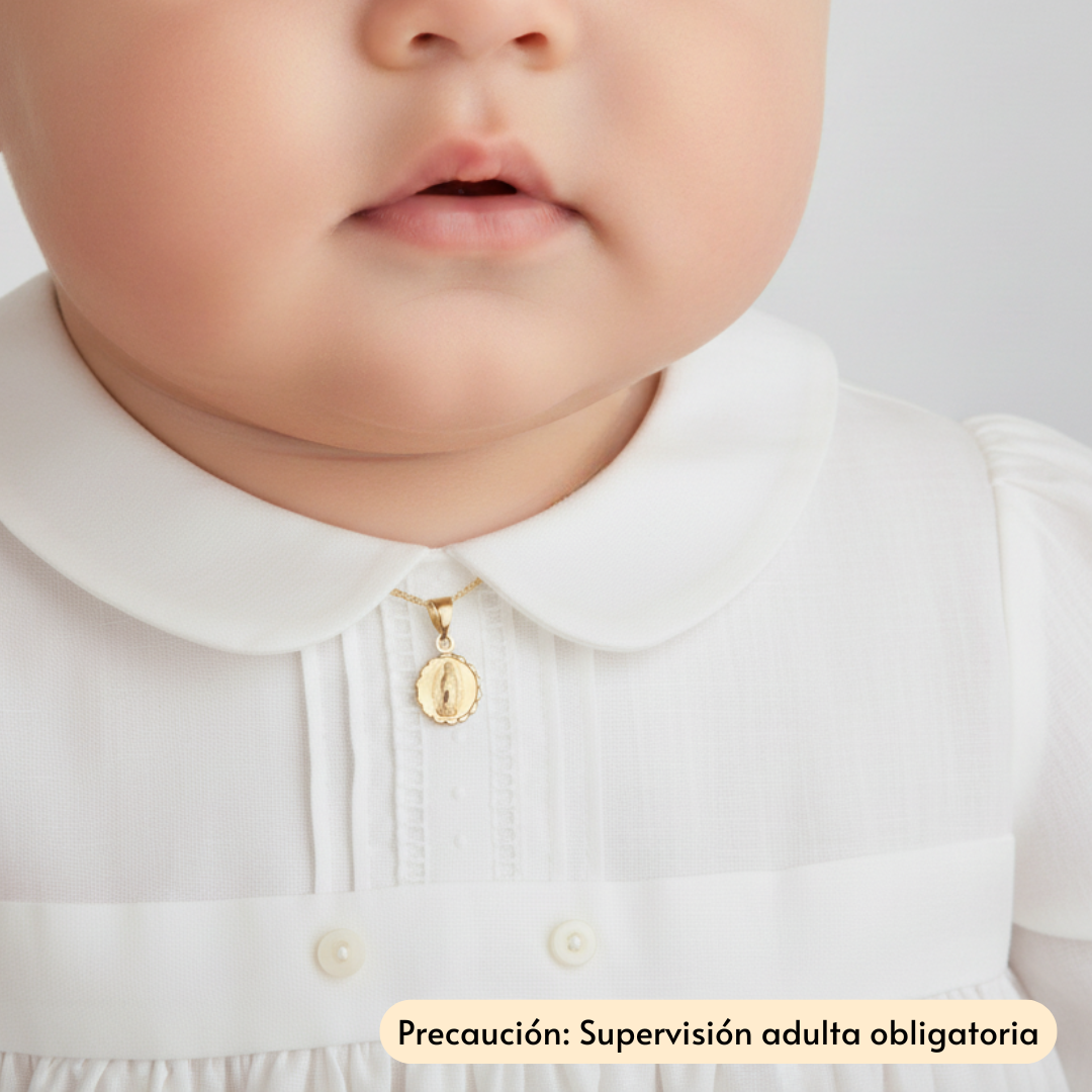 Medalla de bautizo ideal para regalo religioso, con diseño clásico y elegante, imagen de Virgen de Guadalupe perfecta para recién nacido, bebé o niño, símbolo de fe, protección y bendición, recuerdo especial y significativo para el sacramento del bautismo.
