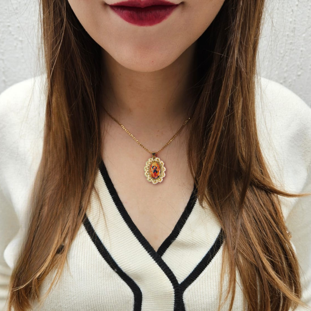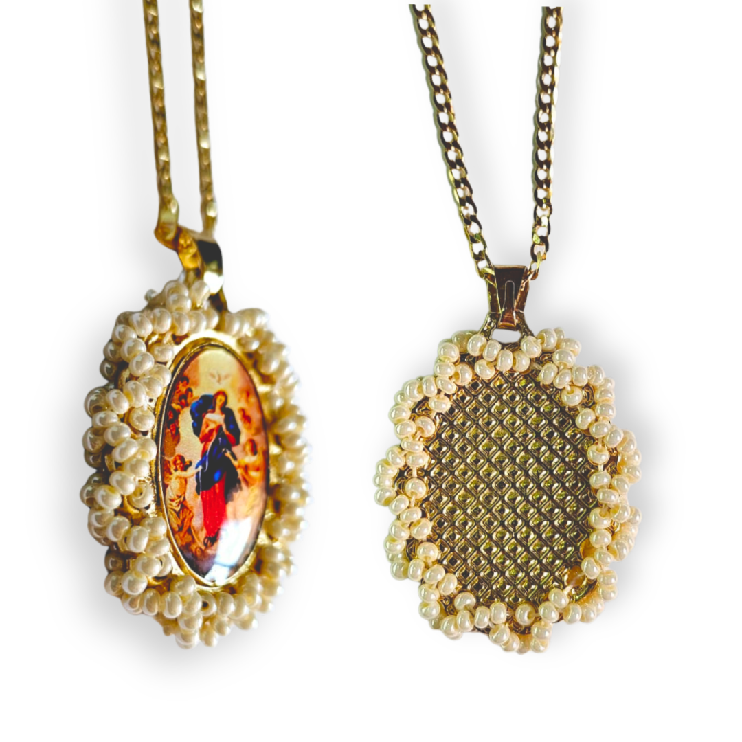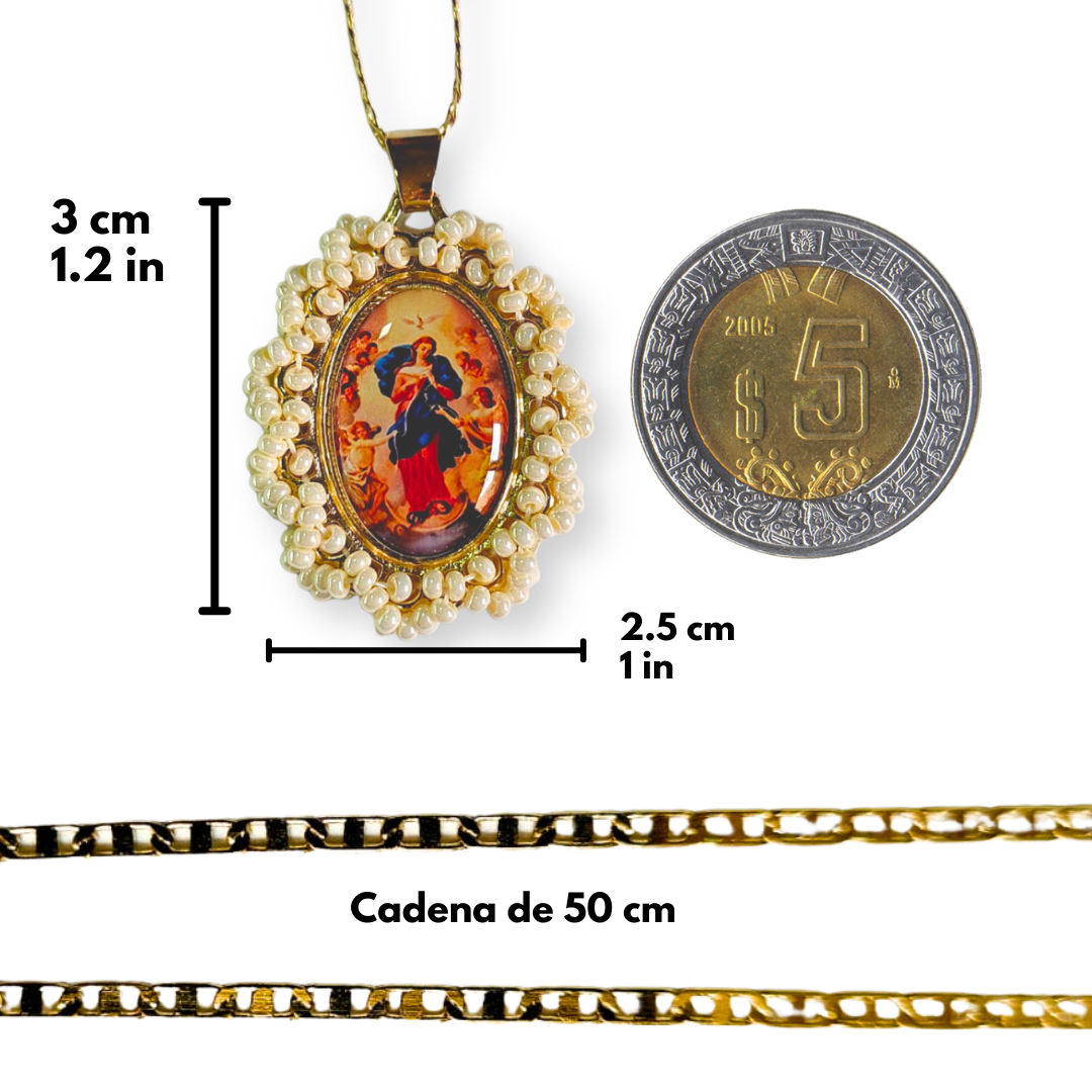 Medalla Virgen Desatanudos Chapa de Oro 14k con Chaquira Perla