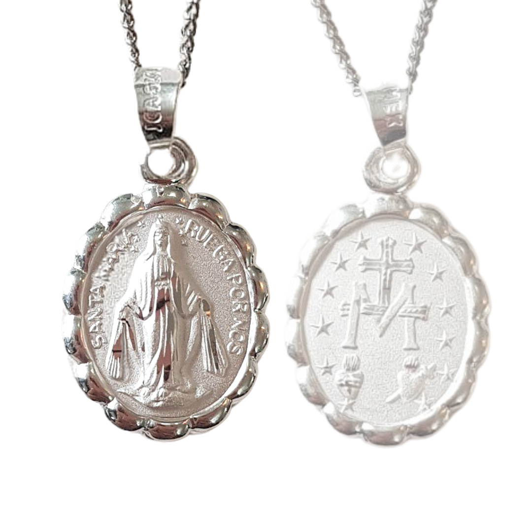 Collar Virgen de la medalla Milagrosa - Plata esterlina de ley 925 - Medalla oval floral con cadena