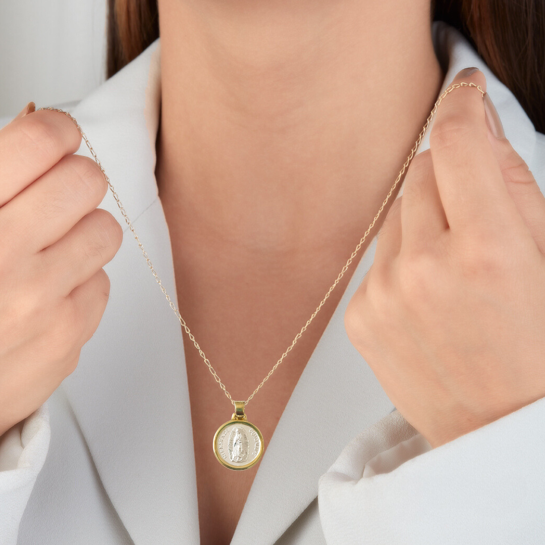 Medalla XL Virgen de Guadalupe y Papa Juan Pablo II con cadena - Plata 925 y Bisel baño de Oro 14k